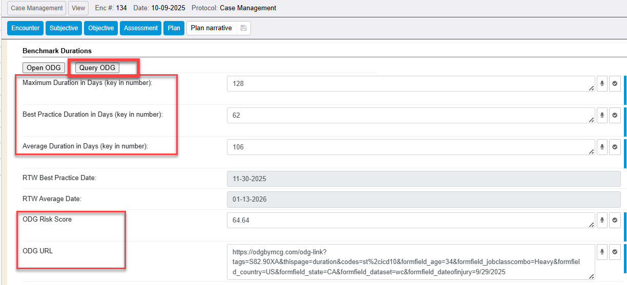 An integration between WebChart and ODG by MCGis available in the 2025-09RC. This integration can improve patient outcomes, reduce administrative costs, and streamline workflows by aligning with industry-standard guidelines. Integration with the ODG by MCG system to access evidence-based guidelines, benchmarking tools, and predictive modeling for best practice and average or maximum days away from work, improving return-to-work (RTW) timelines, medical costs, and quality of care. This integration provides a common framework based on extensive historical claims data (over 10 million lost-time cases), which helps manage costs, reduce inappropriate medical utilization, decrease indemnity costs, and improve worker and patient outcomes.