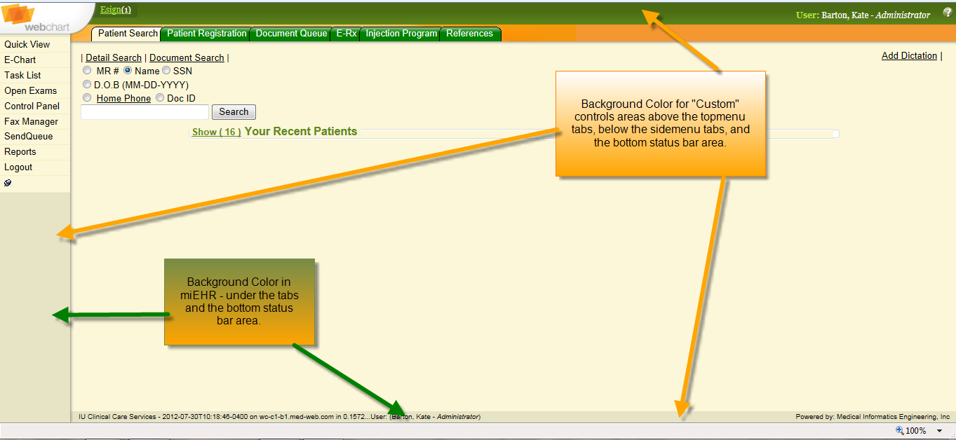 | Background Color | For "Custom", controls the outside frame – above tabs, below sidemenu, bottom status line of WC .For "miEHR", controls below the sidemenu tabs and the status bar at the bottom. | ![]() |